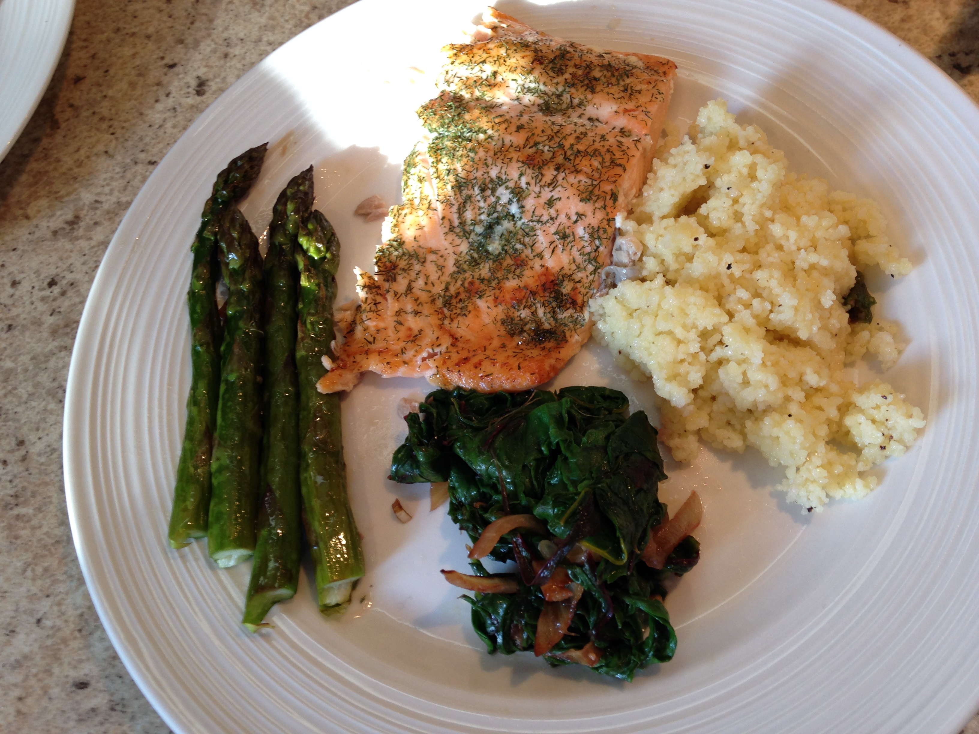 IMG_0313This is the first meal I cooked with vegetables from the market; grilled asparagus and sautéed kale with store-bought wild salmon and couscous.